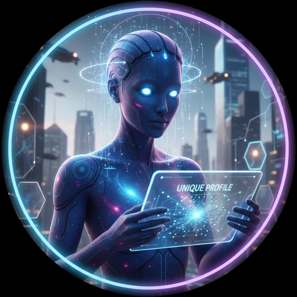 Awatar lub portret stworzony przez algorytmy sztucznej inteligencji na podstawie zdjęcia użytkownika, zawierający elementy personalizacji i unikalnego stylu.