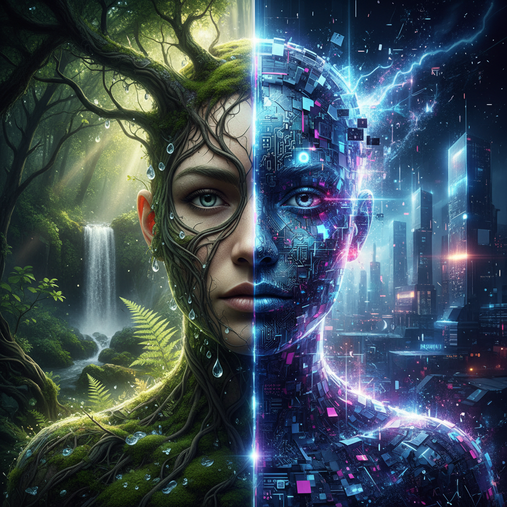 Od najdawniejszych czasów człowiek próbował uchwycić wizerunek siebie na tle otaczającej go natury. Malowidła jaskiniowe były pierwszym „profilowym” – łączyły sylwetkę człowieka z rytmem ziemi, śladami zwierząt i barwami ziemi. Fascynacja organicznymi kształtami, fakturami i kolorem ciągnie się przez sztukę starożytną, średniowieczne iluminacje, renesansowe portrety aż po romantyczne pejzaże i współczesne cyfrowe kolaże. Każda epoka odświeżała tę relację, a dziś, w erze AI i profilowych na Instagramie, zataczamy pełne koło – awatar znowu oddycha lasem, kamieniem, mchem.